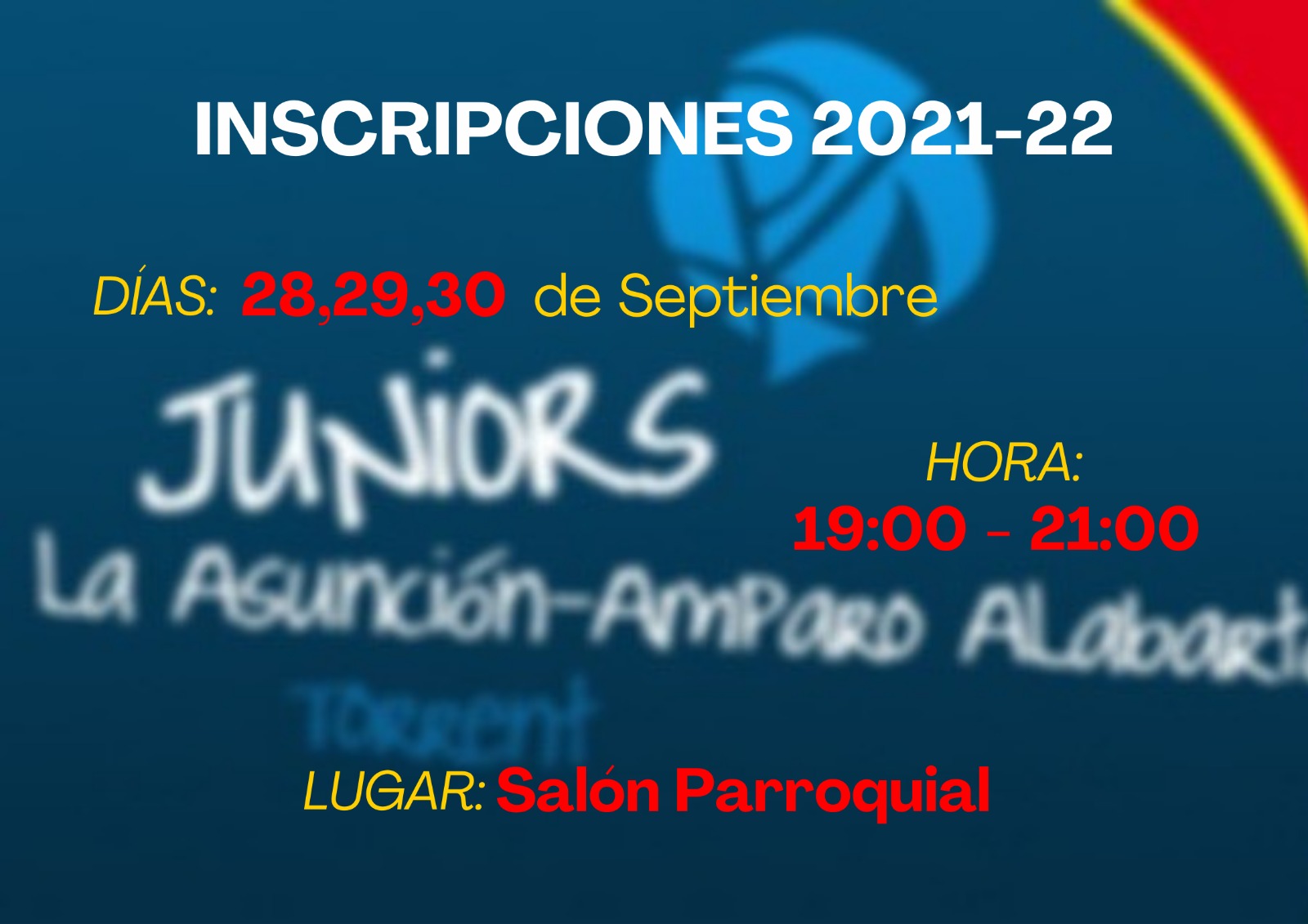 Después del verano, ha llegado el momento de dar comienzo a nuestra actividad pastoral. Por ello, queremos comunicaros que los días que se han habilitado para la inscripción de Juniors son los próximos 28, 29 y 30 de septiembre. Estas tendrán lugar en el salón parroquial, de 19:00 a 21:00 horas.
